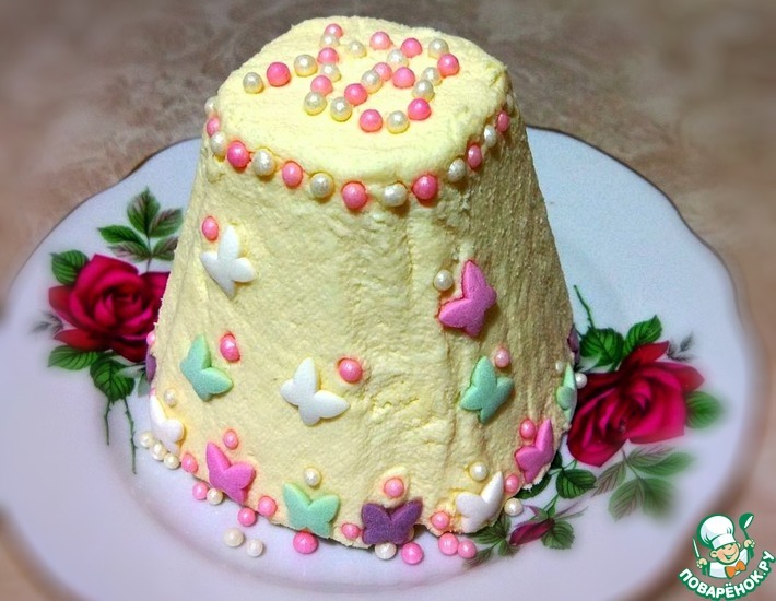 Эта откинута на пасочницу, украшена сахарными бусинками и бабочками.